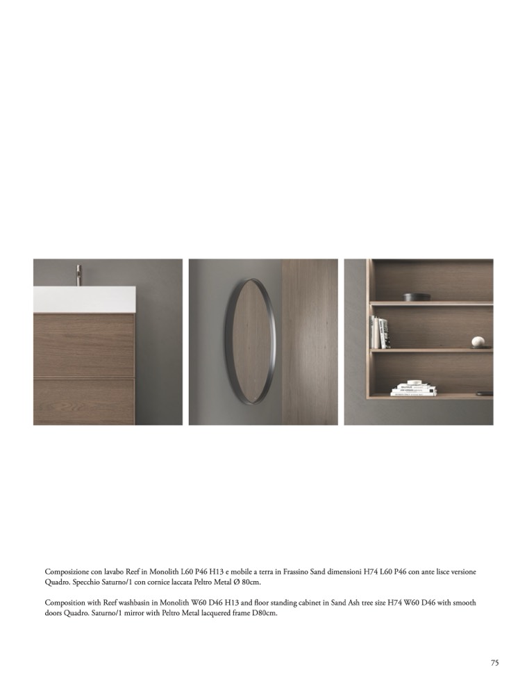 Composizione con lavabo Reef in Monolith L60 P46 H13 e mobile a terra in Frassino Sand dimensioni H74 L60 P46 con ante lisce versione