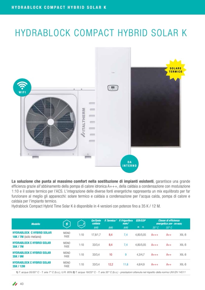 1) T. acqua 35/30° C - T. aria 7° C (b.s.), U.R. 85% 2) T. acqua 18/23° C - T. aria 35° C (b.s.) - prestazioni ottenute nel rispetto della norma UNI EN 14511
