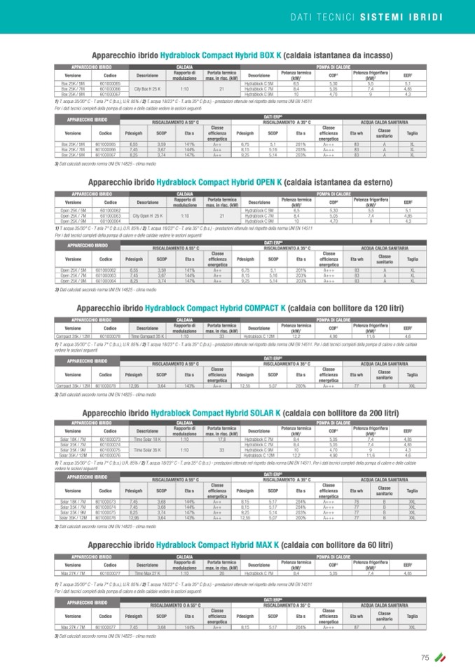 1) T. acqua 35/30° C - T aria 7° C (b.s.) U.R. 85% / 2) T. acqua 18/23° C - T. aria 35° C (b.s.) - prestazioni ottenute nel rispetto della norma UNI EN 14511. Per i dati tecnici completi della pompa di calore e delle caldaie