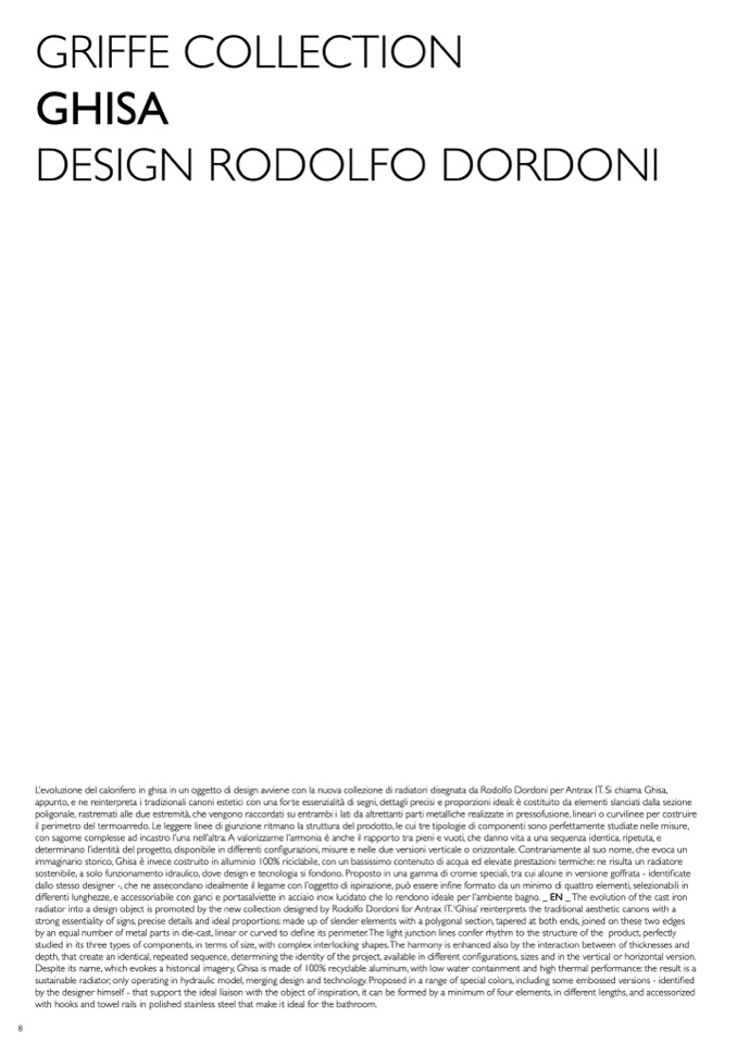 radiator into a design object is promoted by the new collection designed by Rodolfo Dordoni for Antrax IT. ‘Ghisa’ reinterprets the traditional aesthetic canons with a