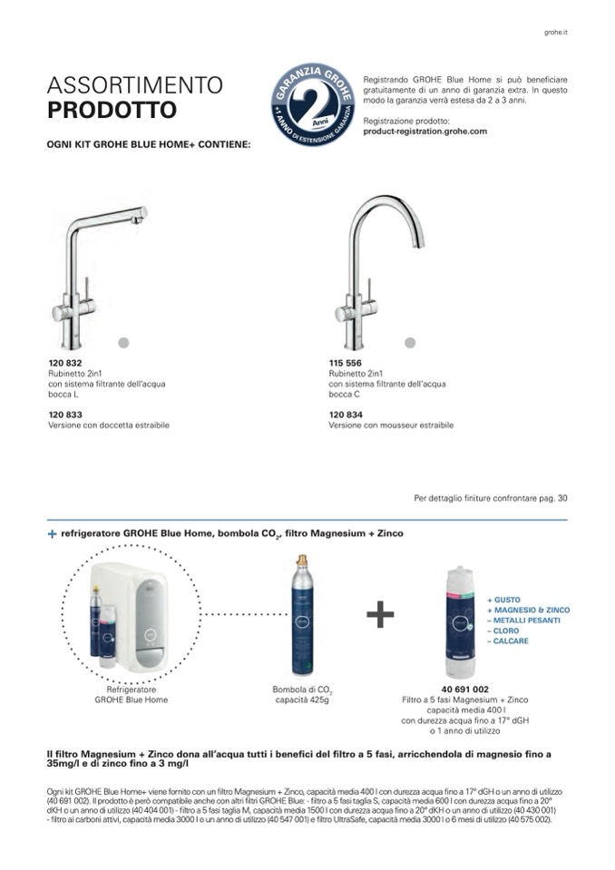 (40 691 002). Il prodotto è però compatibile anche con altri filtri GROHE Blue: - filtro a 5 fasi taglia S, capacità media 600 l con durezza acqua fino a 20°