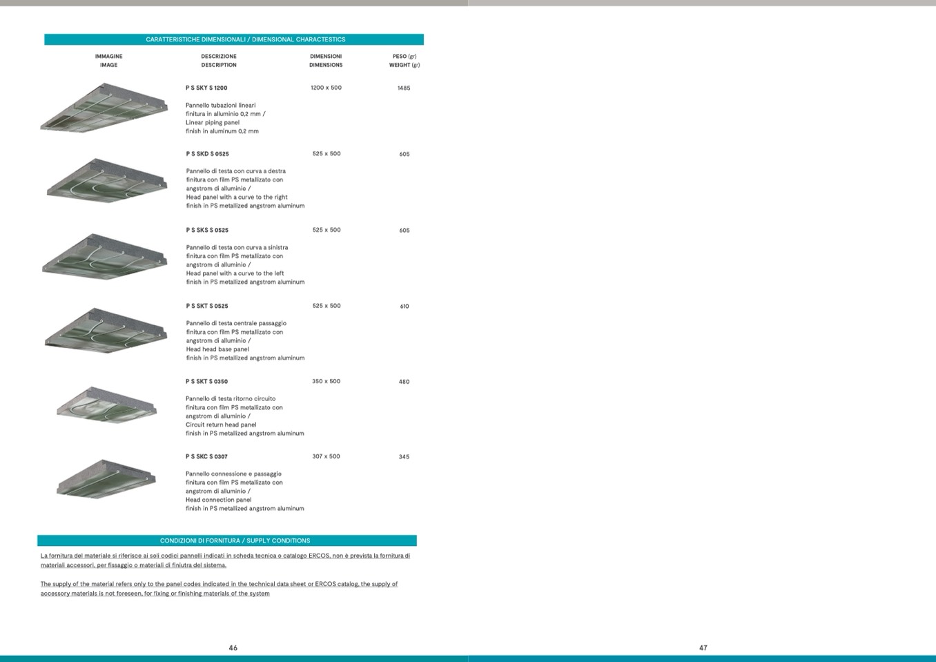 The supply of the material refers only to the panel codes indicated in the technical data sheet or ERCOS catalog, the supply of