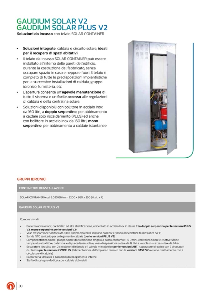 Componentistica solare: gruppo solare di circolazione singolo a basso consumo (1÷6 l/min), centralina solare e relative sonde