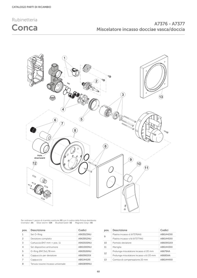 Per ordinare il pezzo di ricambio sostituire XX con il codice della finitura desiderata