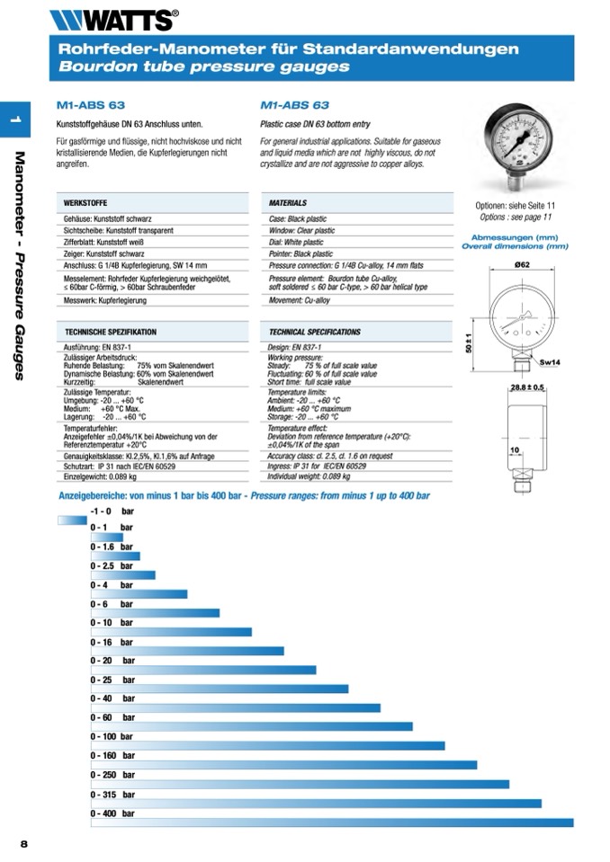 Anzeigebereiche: von minus 1 bar bis 400 bar - Pressure ranges: from minus 1 up to 400 bar
