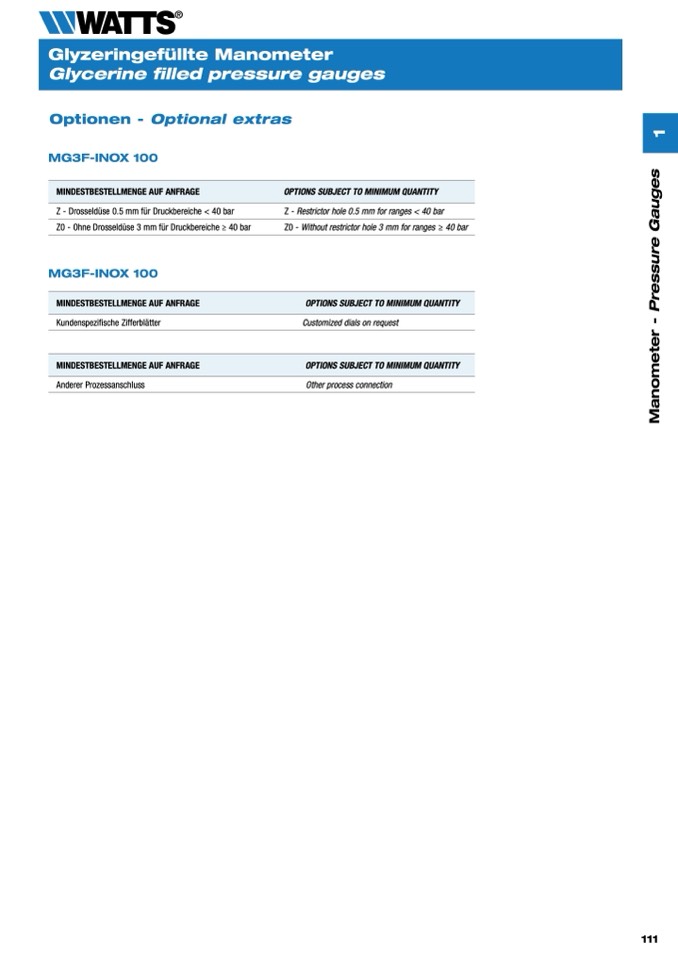 Z - Restrictor hole 0.5 mm for ranges < 40 bar