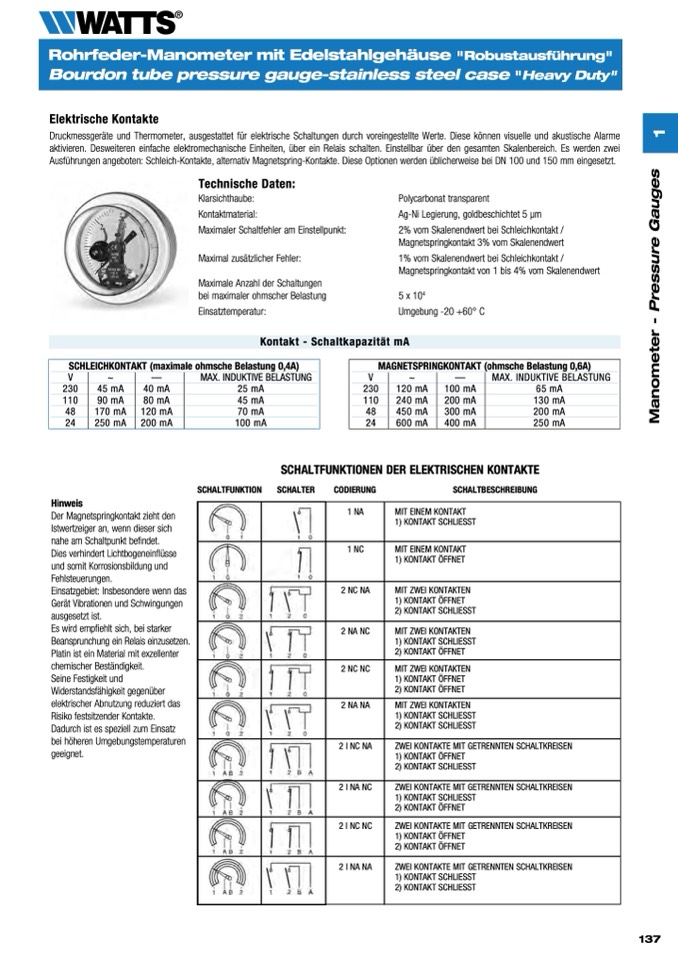 Druckmessgeräte und Thermometer, ausgestattet für elektrische Schaltungen durch voreingestellte Werte. Diese können visuelle und akustische Alarme
