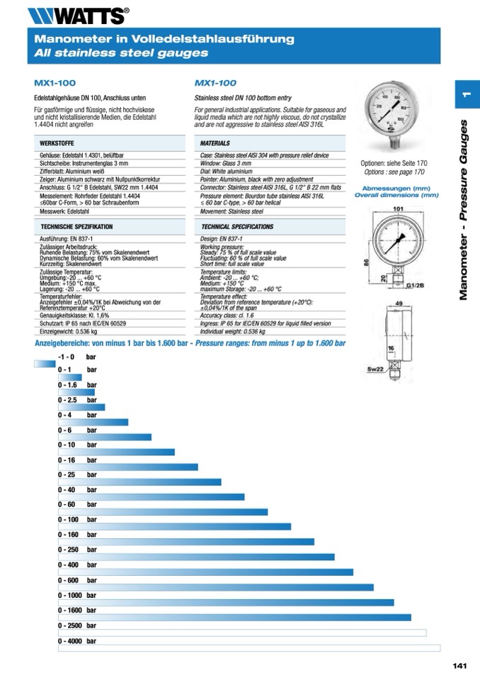 Anzeigebereiche: von minus 1 bar bis 1.600 bar - Pressure ranges: from minus 1 up to 1.600 bar