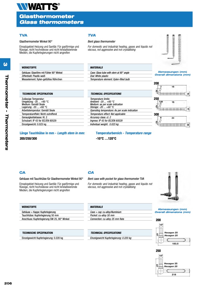 Glasthermometer Winkel 90°