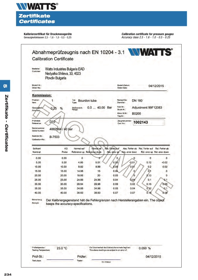 Calibration certificate for pressure gauges