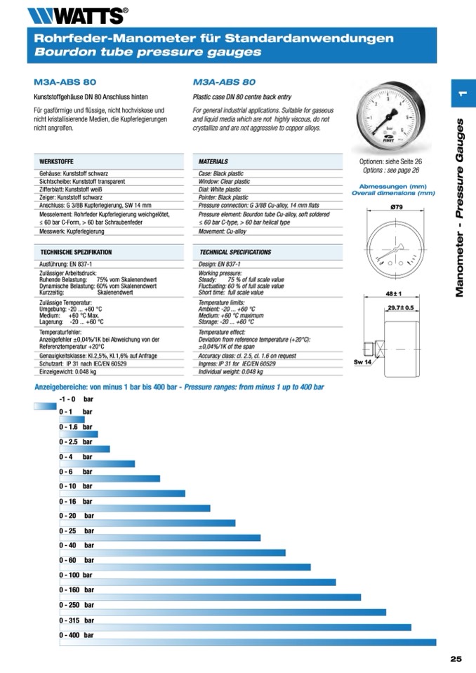 Anzeigebereiche: von minus 1 bar bis 400 bar - Pressure ranges: from minus 1 up to 400 bar