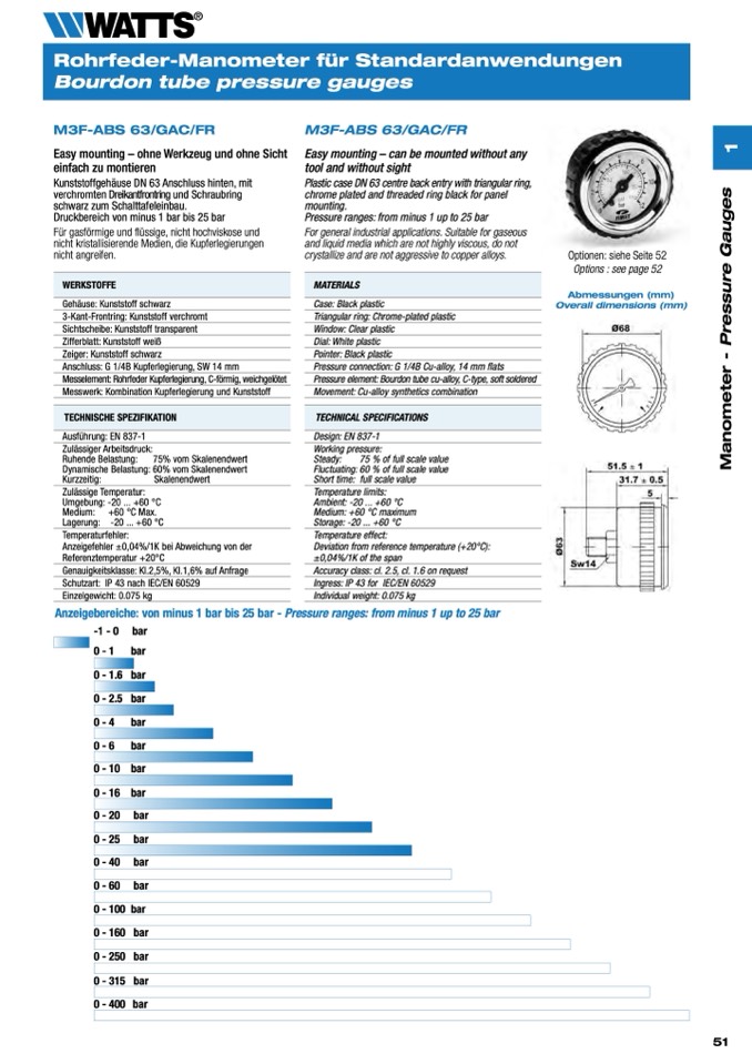 Anzeigebereiche: von minus 1 bar bis 25 bar - Pressure ranges: from minus 1 up to 25 bar