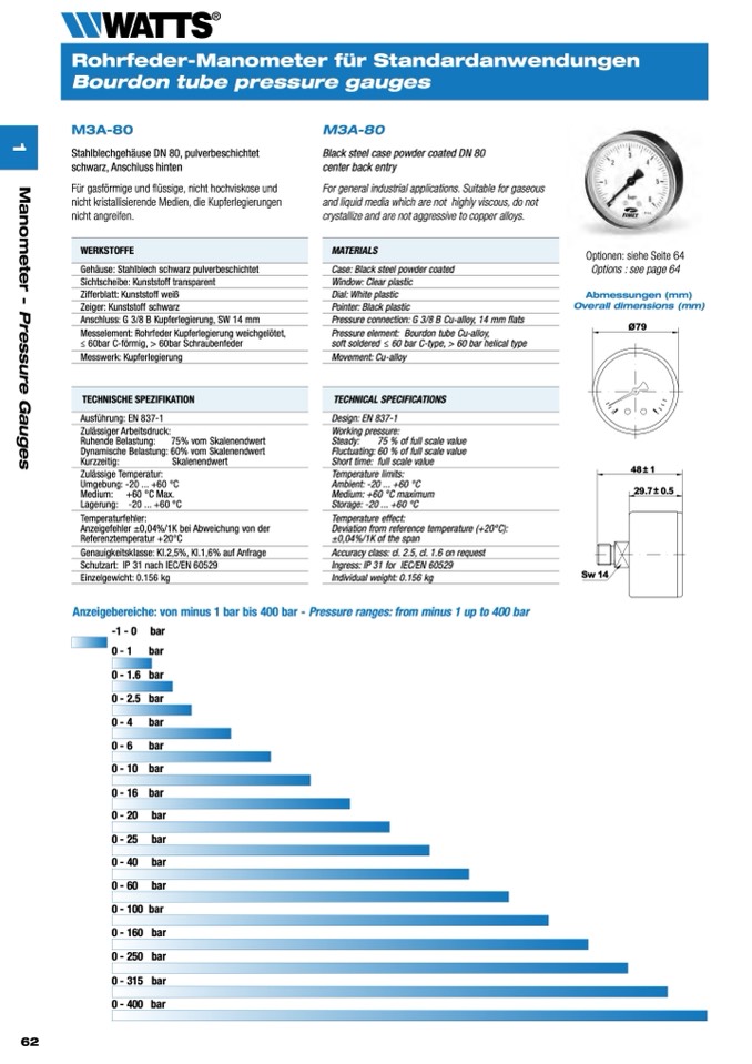 Anzeigebereiche: von minus 1 bar bis 400 bar - Pressure ranges: from minus 1 up to 400 bar