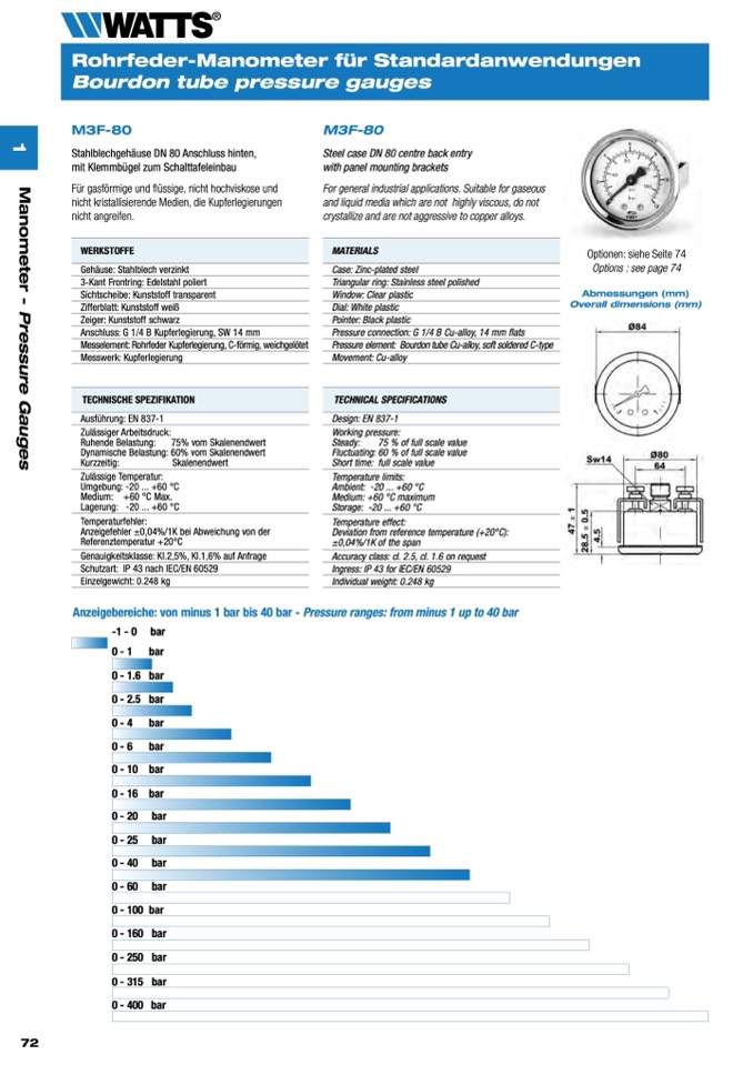 Anzeigebereiche: von minus 1 bar bis 40 bar - Pressure ranges: from minus 1 up to 40 bar