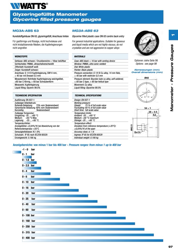 Anzeigebereiche: von minus 1 bar bis 400 bar - Pressure ranges: from minus 1 up to 400 bar