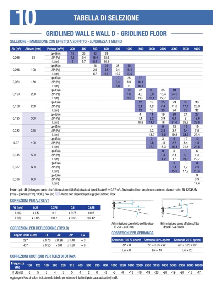I valori Lp in dB (A) tengono conto di un'attenuazione di 8 dB(A) dovuta al tipo di locale Vt = 0.37 m/s. Test realizzati con un plenum conforme alla normativa EN 12238.Vk