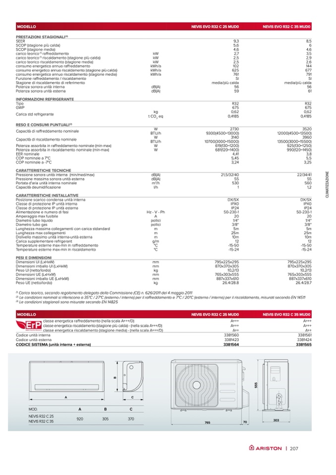 Le condizioni nominali si riferiscono a 35°C / 27°C (esterno / interno) per il raffreddamento e 7°C / 20°C (esterno / interno) per il riscaldamento, misurati secondo EN 14511