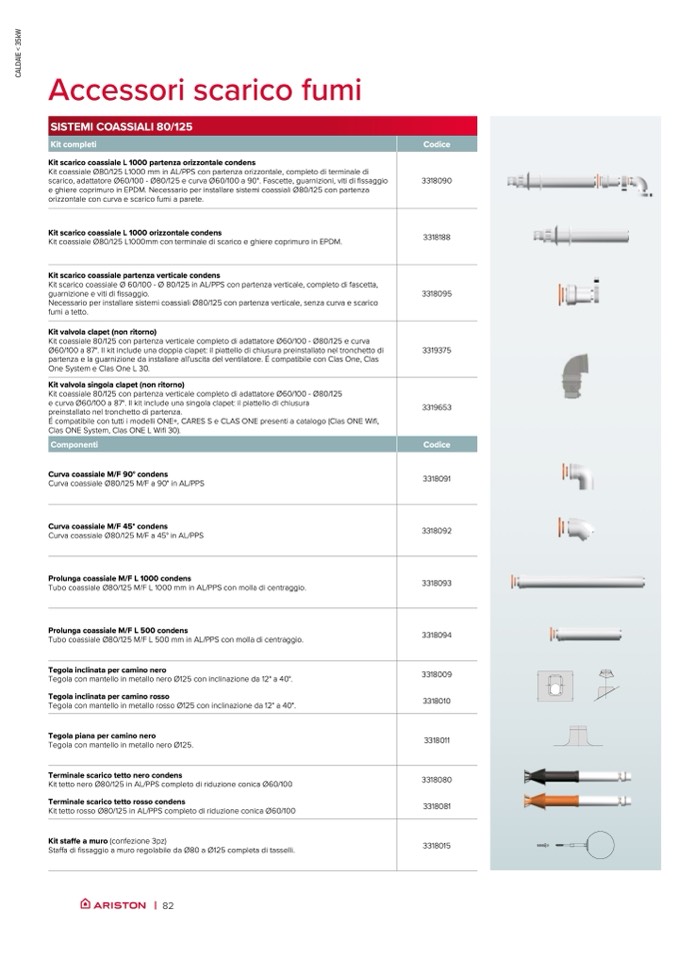 scarico, adattatore Ø60/100 - Ø80/125 e curva Ø60/100 a 90°. Fascette, guarnizioni, viti di