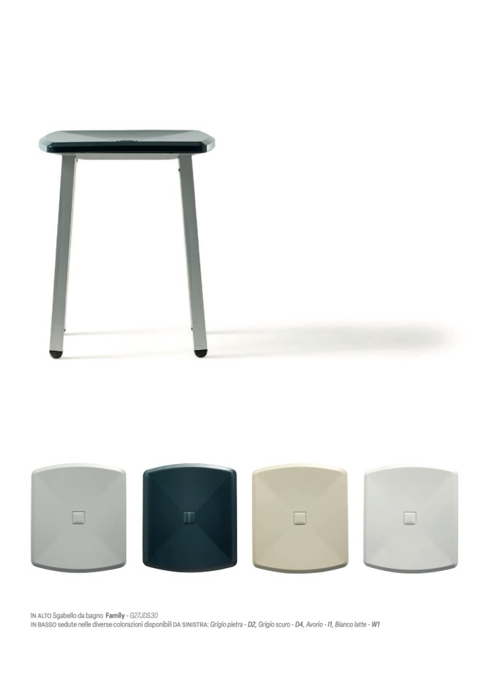 in basso sedute nelle diverse colorazioni disponibili da sinistra: Grigio pietra - D2, Grigio scuro - D4, Avorio - I1, Bianco latte - W1