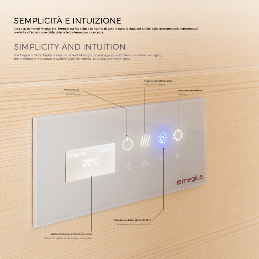 Il display comandi Megius è di immediata fruibilità e consente di gestire tutte le funzioni on/off: dalla gestione della temperatura
