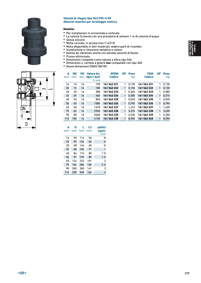 • La valvola fa tenuta con una pressione di almeno 1 m di colonna d'acqu