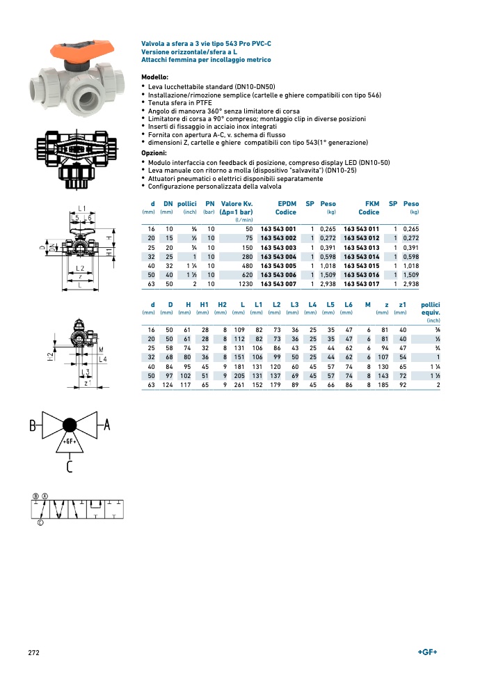 Valvola a sfera a 3 vie tipo 543 Pro PVC-