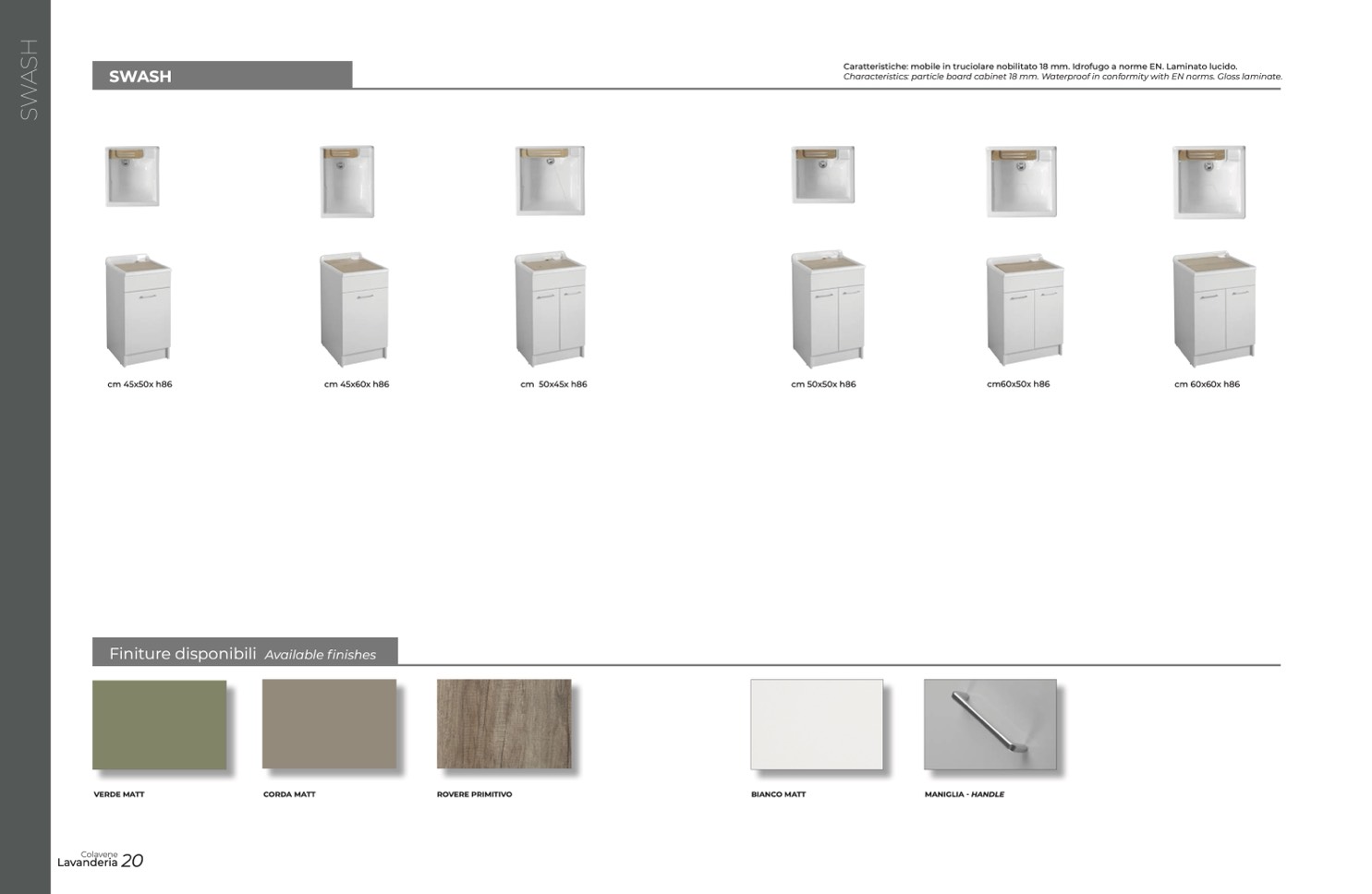 Characteristics: particle board cabinet 18 mm. Waterproof in conformity with EN norms. Gloss laminate.