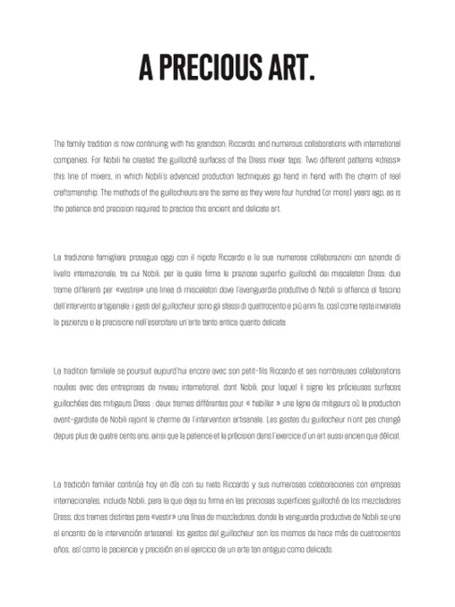 livello internazionale, tra cui Nobili, per la quale firma le preziose superfici guilloché dei miscelatori Dress: due
