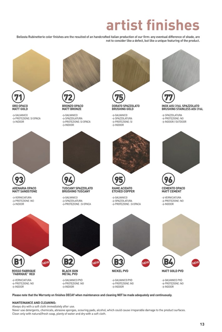 Bellosta Rubinetterie color finishes are the resulted of an handcrafted italian production of our firm: any eventual difference of shade, are