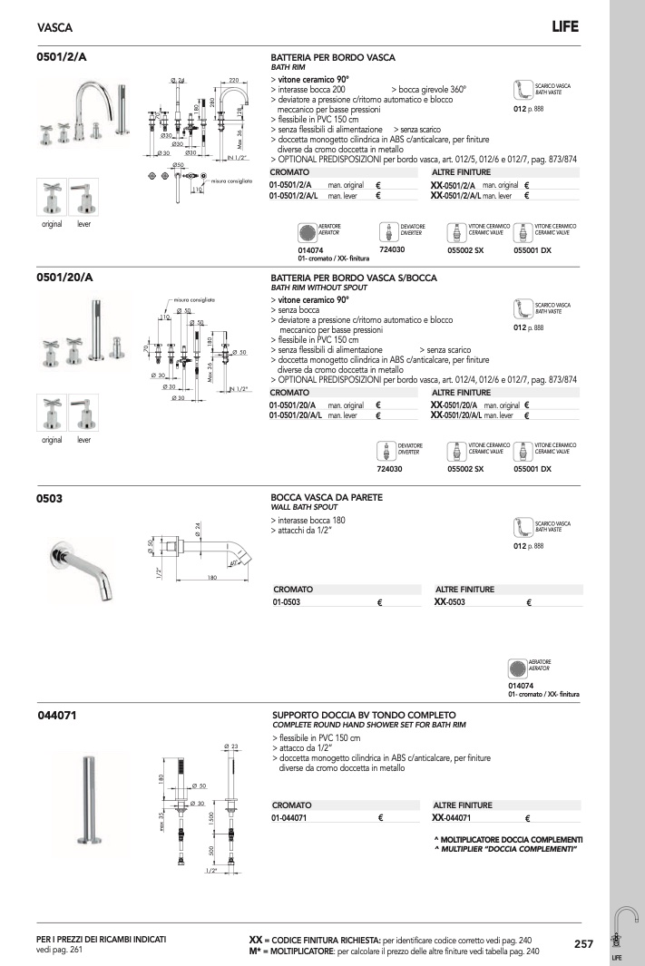 > OPTIONAL PREDISPOSIZIONI per bordo vasca, art. 012/4, 012/6 e 012/7, pag. 873/874
