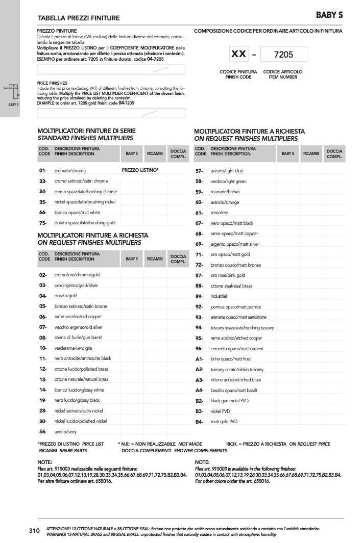 WARNING! 13-NATURAL BRASS and 88-SISAL BRASS: unprotected finishes that naturally oxidise in contact with atmospheric humidity.