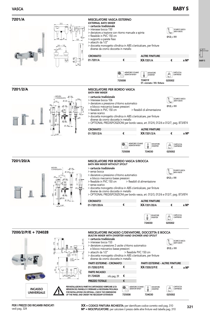 > OPTIONAL PREDISPOSIZIONI per bordo vasca, art. 012/4, 012/6 e 012/7, pag. 873/874