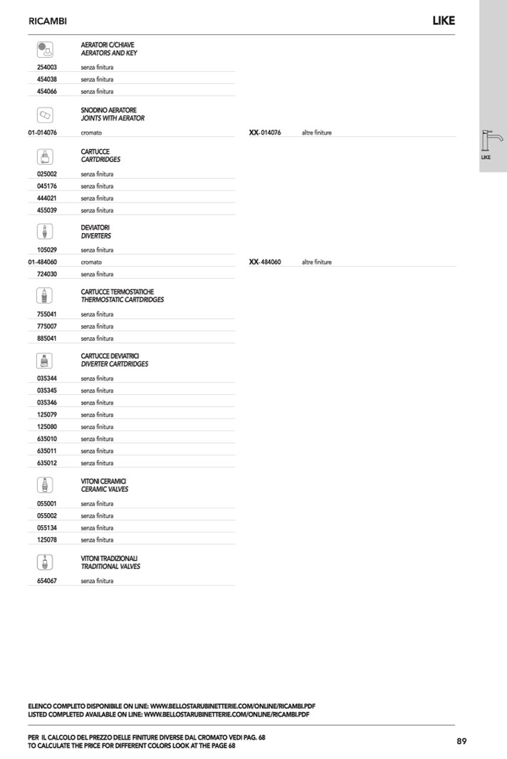 ELENCO COMPLETO DISPONIBILE ON LINE: WWW.BELLOSTARUBINETTERIE.COM/ONLINE/RICAMBI.PDF