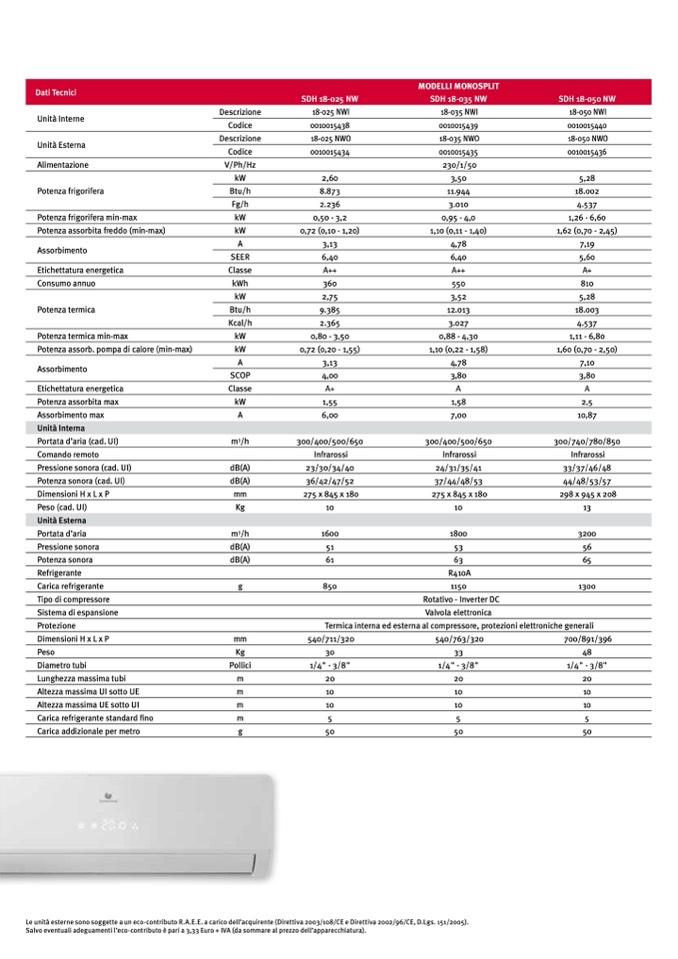 Le unità esterne sono soggette a un eco-contributo R.A.E.E. a carico dell’acquirente (Direttiva 2003/108/CE e Direttiva 2002/96/CE, D.Lgs. 151/2005).