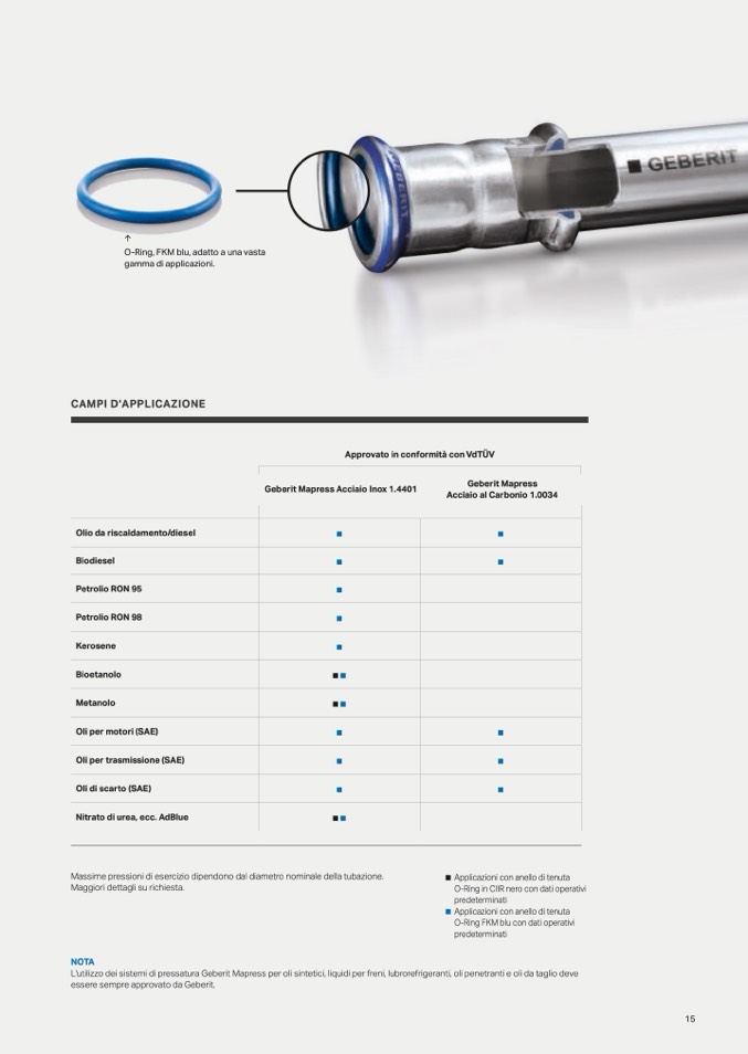 L'utilizzo dei sistemi di pressatura Geberit Mapress per oli sintetici, liquidi per freni, lubrorefrigeranti, oli penetranti e oli da taglio deve