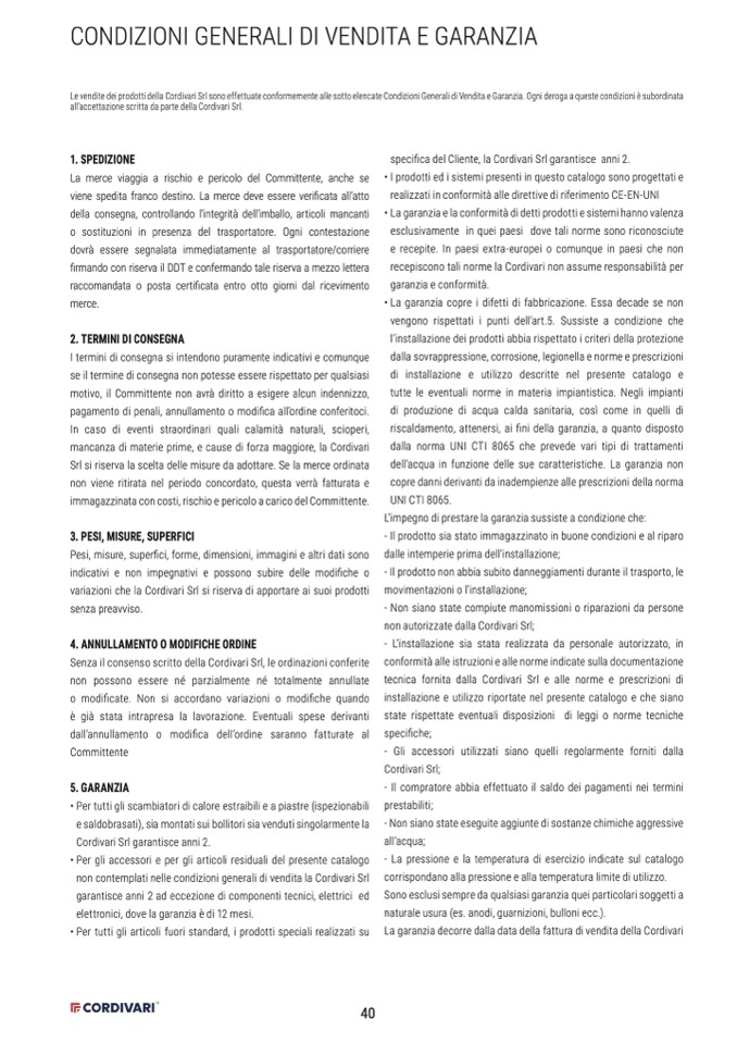 Le vendite dei prodotti della Cordivari Srl sono effettuate conformemente alle sotto elencate Condizioni Generali di Vendita e Garanzia. Ogni deroga a queste condizioni è subordinata