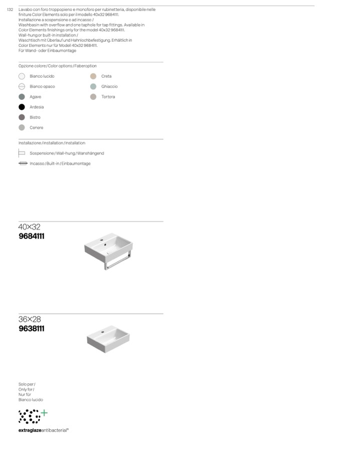 132 Lavabo con foro troppopieno e monoforo per rubinetteria, disponibile nelle