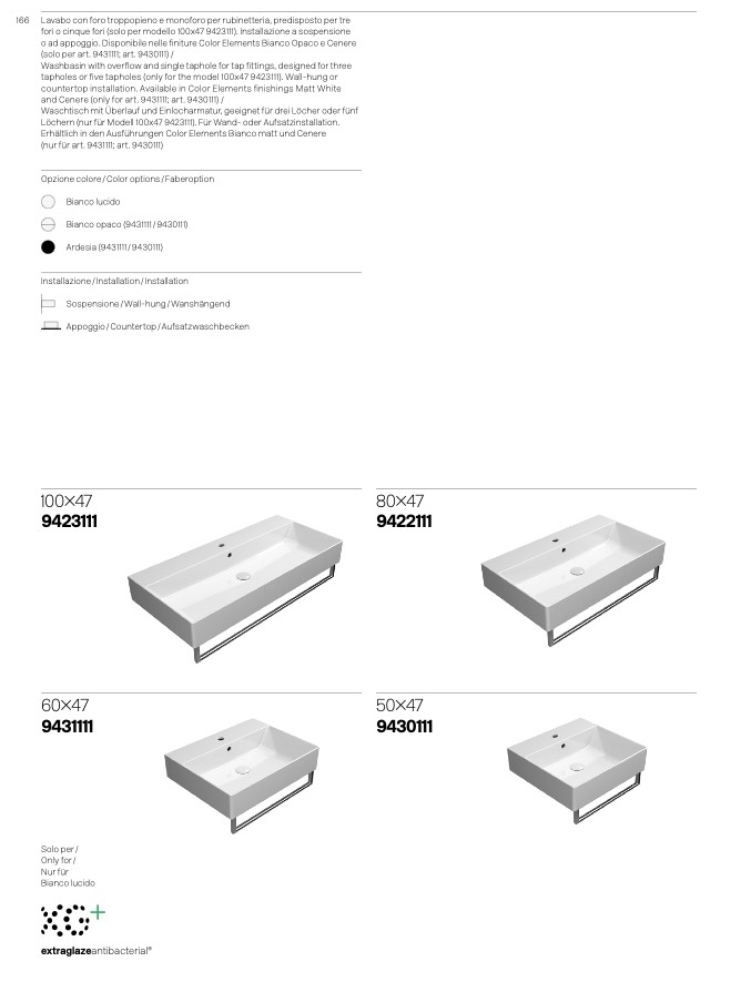 tapholes or five tapholes (only for the model 100x47 9423111). Wall-hung or