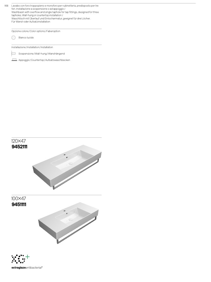 168 Lavabo con foro troppopieno e monoforo per rubinetteria, predisposto per tre