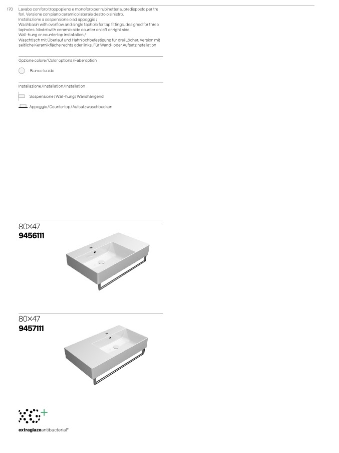170 Lavabo con foro troppopieno e monoforo per rubinetteria, predisposto per tre