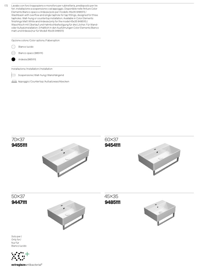 tapholes. Wall-hung or countertop installation. Available in Color Elements