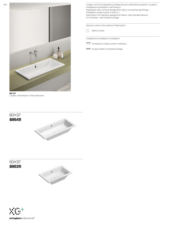 Lavabo con foro troppopieno predisposto per rubinetteria a parete o su piano.