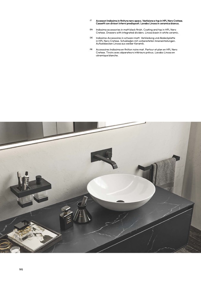 Indissima accessories in matt black finish. Coating and top in HPL Ner