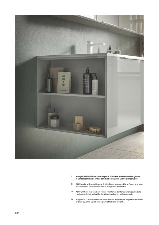 ALU-Griff mit mattweißem Finish. Fronten und offenes Endmodul in Seta-