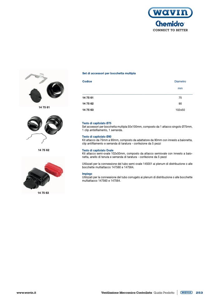 Set accessori per bocchetta multipla 50x100mm, composto da 1 attacco singolo Ø75mm,