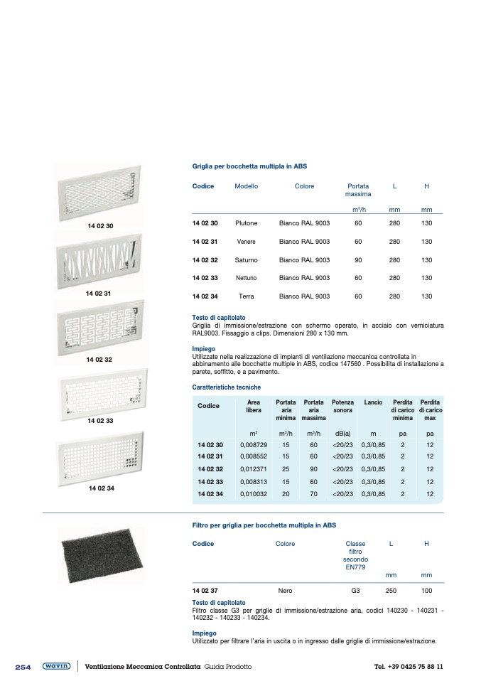 Filtro classe G3 per griglie di immissione/estrazione aria, codici 140230 - 140231 -