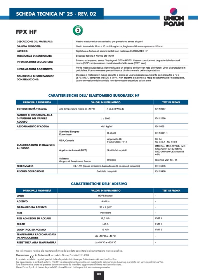 Per applicazioni in ambienti esterni, FPX HF va adeguatamente protetto con rivestimento esterno Union Covering o protetto con vernice polimerica Vec.