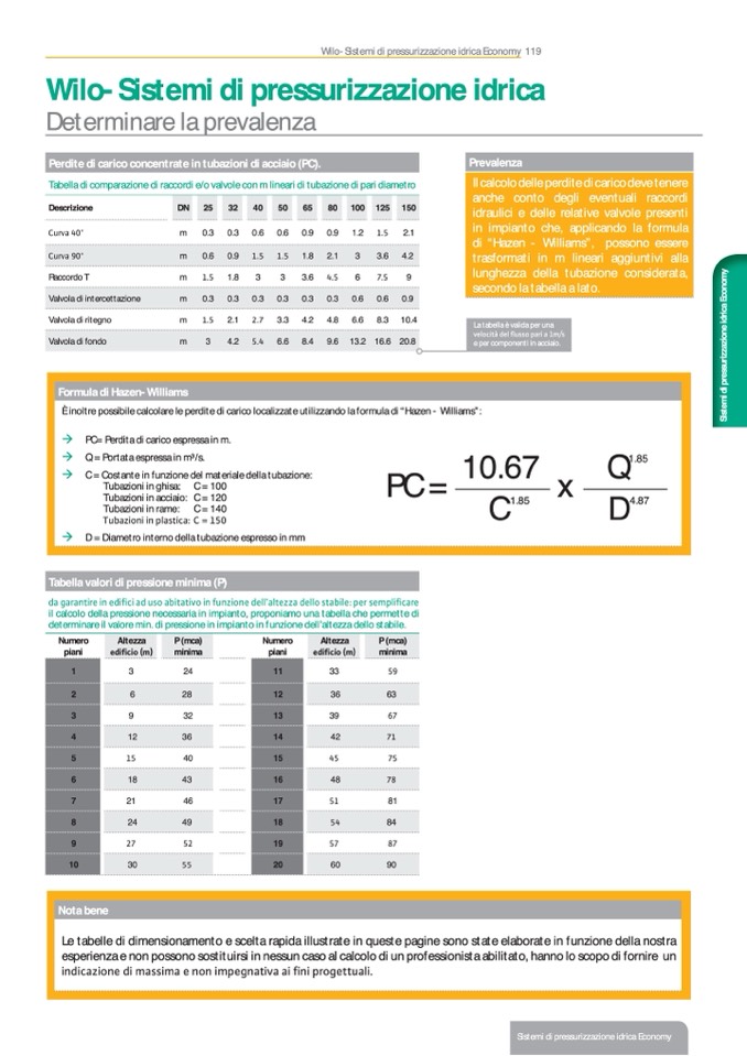 il calcolo della pressione necessaria in impianto, proponiamo una tabella che permette di