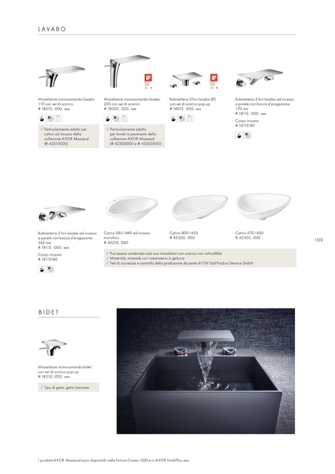 I prodotti AXOR Massaud sono disponibili nella finitura Cromo -000 e in AXOR FinishPlus -xxx.