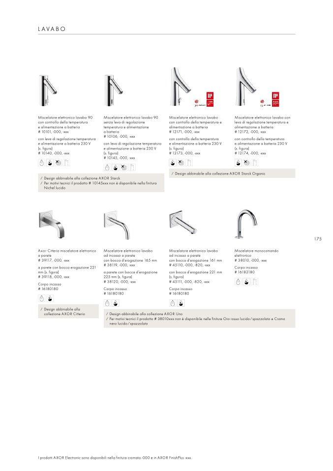 I prodotti AXOR Electronic sono disponibili nella finitura cromata -000 e in AXOR FinishPlus -xxx.